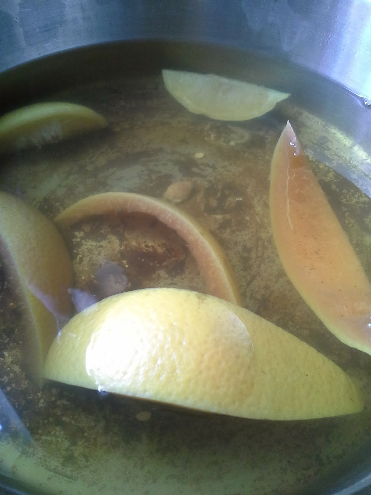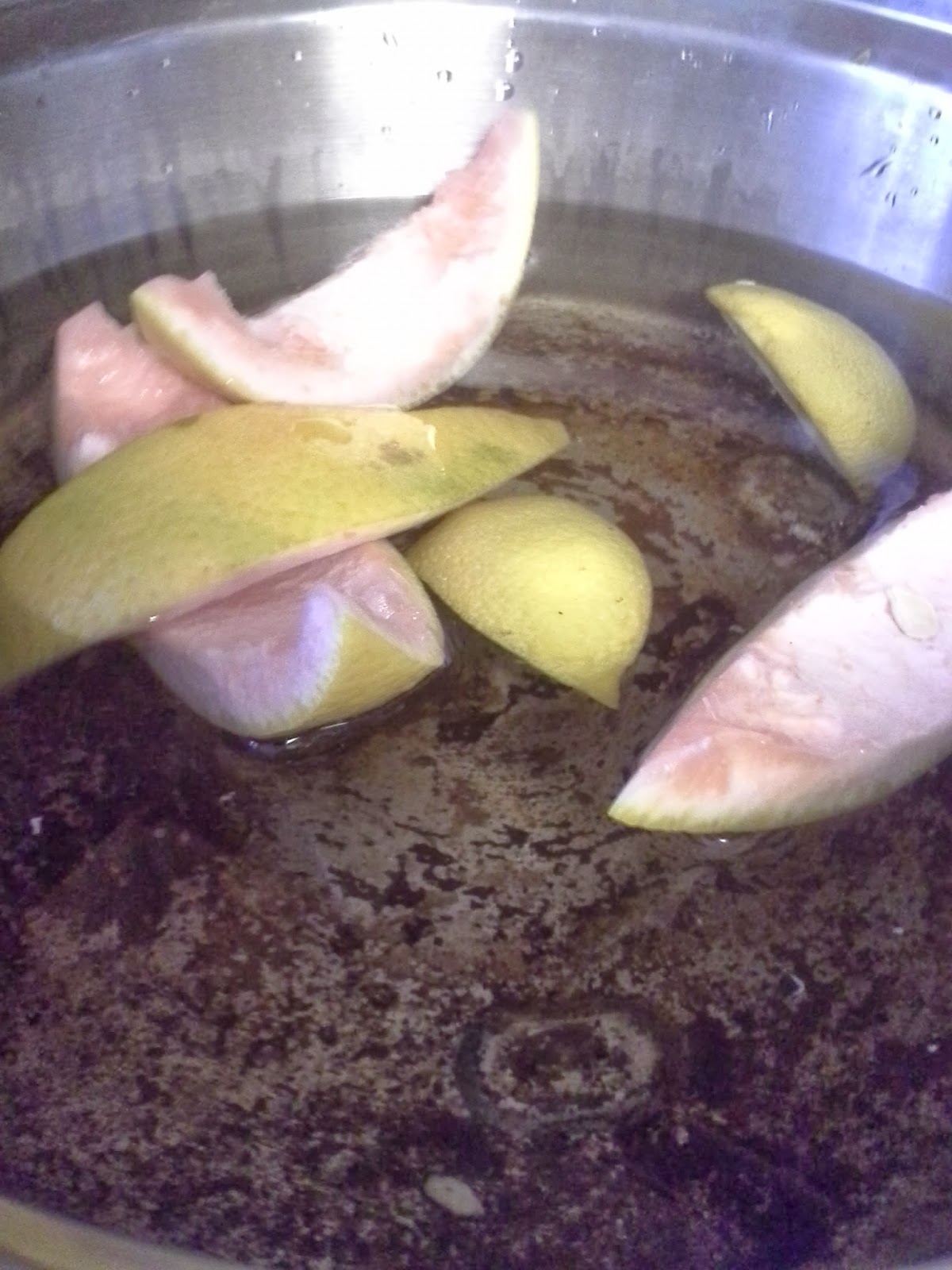 於是把4片葡萄柚皮 半顆檸檬 丟到電鍋裡